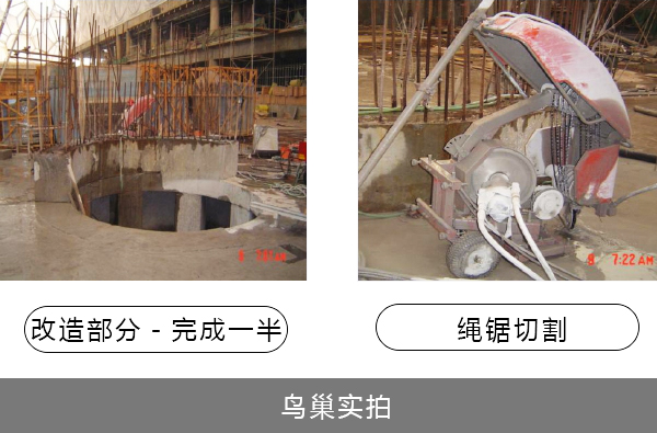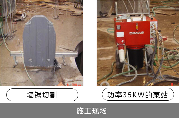 由于結(jié)構(gòu)中含有的鋼筋太多 強度太高,傳統(tǒng)的水鉆排孔方式已經(jīng)不能夠拆除,液壓剪也無法使用,所以使用進口大功率液壓墻鋸切割。